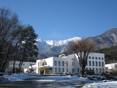 正門からは、南アルプスの雪景色がきれいに見えます。