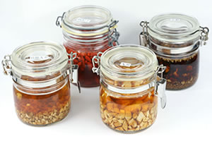 疲労回復や冷え性などに良いとされているリンゴ酒。「むつ」などの酸味の強いリンゴが適しています。リンゴをよく洗った後、皮はそのまま残し、8等分して濁りの原因となる芯の部分を取り除き、ホワイトリカーに漬けます。レモンの入れ方はいちご酒と同様です。 |