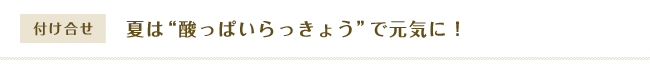 さらに酢漬けのらっきょうなら、なおよし。酢に含まれる酢酸は新陳代謝を促すため、疲労回復やダイエットにも効果的。抗菌・防腐作用もあるので、食べ物が傷みやすい夏に最適です。