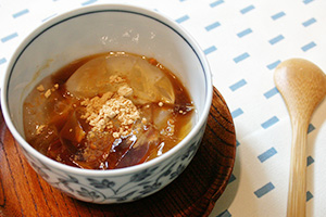 水ゼリー+黒蜜+きな粉黒蜜をかけてきな粉をトッピングすれば、見た目も味も「わらび餅」!良質なたんぱく質やミネラル、ビタミンを含むきな粉と水ゼリーは相性抜群です。 |