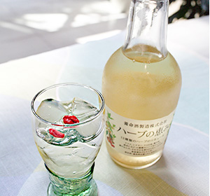 水ゼリー+ハーブの恵み水ゼリーに13種のハーブが香るリキュール「ハーブの恵み」を垂らして、クコの実をトッピングすれば、ほっと心安らぐ癒し系スイーツに。水ゼリーが氷の代わりにもなり、シナモンなど優しいハーブの香りと、とろんとしたのど越しが絶妙です。 |