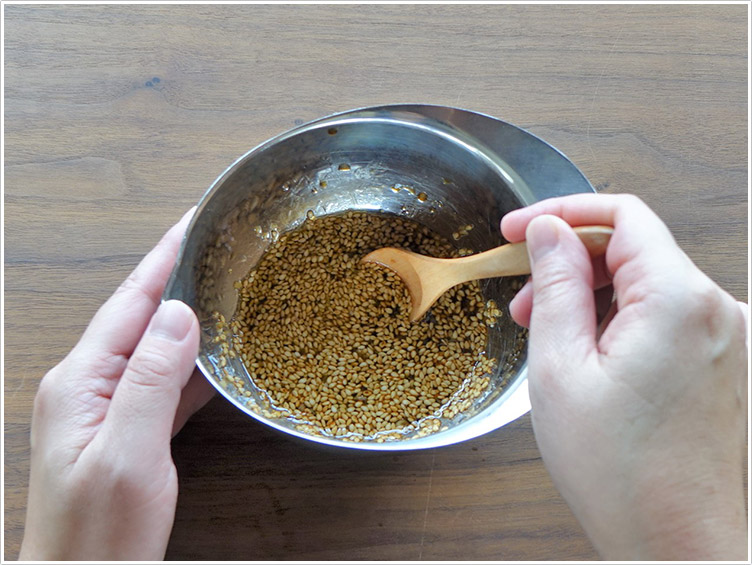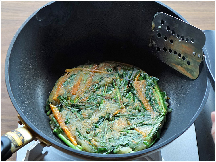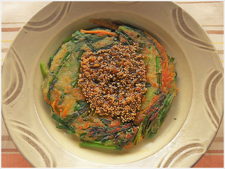 | 5.フライパンにごま油を入れて熱し、4.の半量を円形にして流し入れ、両面をこんがり焼く。残りの半量も同様に焼く。 | ![]() |