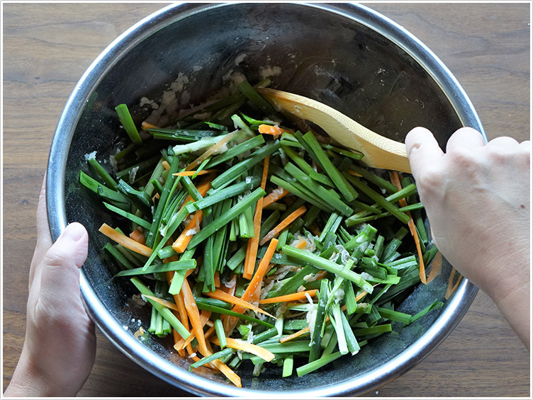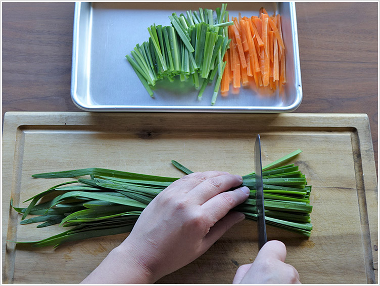 | 2.ニラは長さ4㎝に切り、にんじんは千切りにする。 | ![]() |