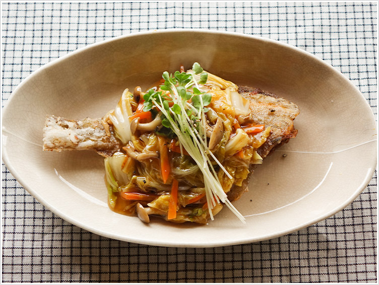 胃腸にやさしいといわれるカレイをカラッと揚げ、旬の野菜の甘酢あんをたっぷりかけた一品です。腸を潤すといわれる白菜は、胃腸の調子を整えるのに役立ちます。また、血(ケツ)を補うといわれるにんじんは体力不足の方に、血液の巡りをよくして体を温めるといわれる白ネギは冷え症の方におすすめです。栄養豊富な野菜をたくさんとれて、風邪予防にも役立つ冬のおすすめメニューです。