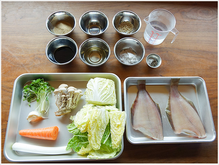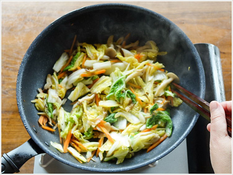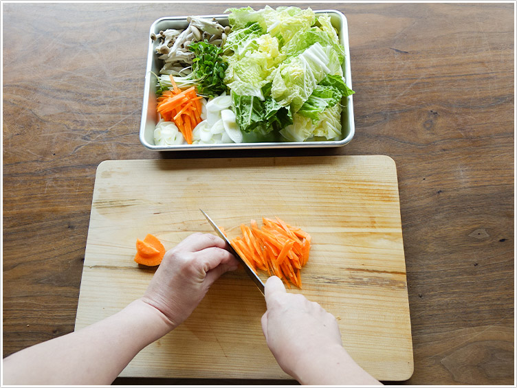 | 1.白菜の葉はざく切りにし、芯は短冊切りにする。にんじんは千切り、白ネギは斜め切り。しめじの石づきを落として手でほぐし、ニンニクはスライスする。 | ![]() |