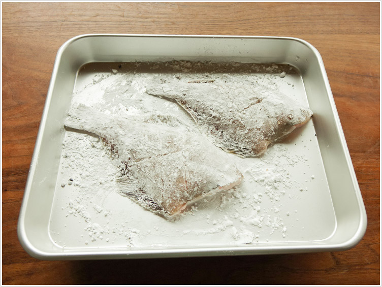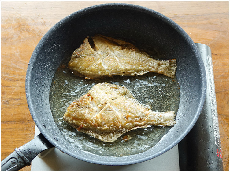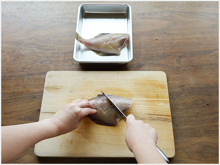 | 2.カレイはウロコを取り、皮に切れ目を入れる。 | ![]() |