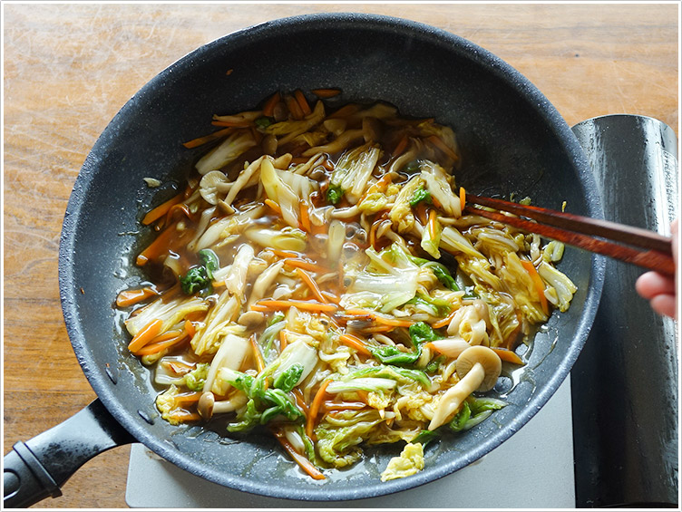 | 5.カレイの油を切り、揚げ油を取り出したら、キッチンペーパーでフライパンの汚れを拭き取る。サラダ油と1.を加え、野菜が全体にしんなりするまで炒める。 | ![]() |