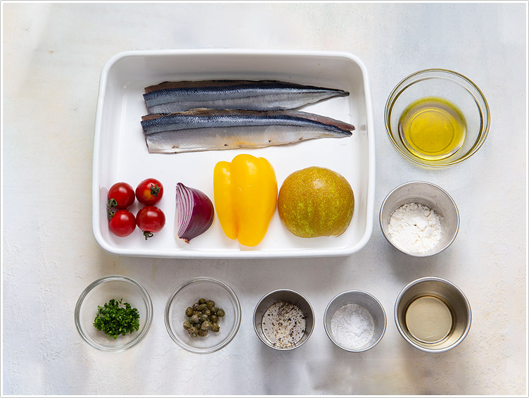 | 3.さんまの小骨を除き、塩をふって少し置く。水分が出てきたら臭みを消すためにしっかりとふき取ってこしょうをふり、小麦粉を全体にまぶす。 | ![]() |