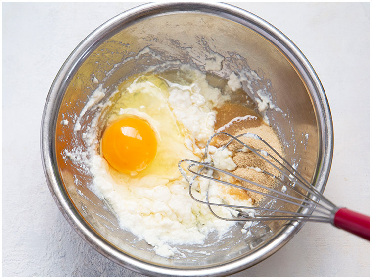 | 3.ボウルに絹豆腐を入れホイッパーでなめらかになるまで混ぜ、卵・きび砂糖・油を加え混ぜる。 |