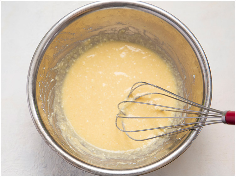 | 5.フライパンを中火で熱し、生地を丸く流し入れる。表面がプツプツしてきたら裏返して火を弱め、2分ほど焼く。 | ![]() |