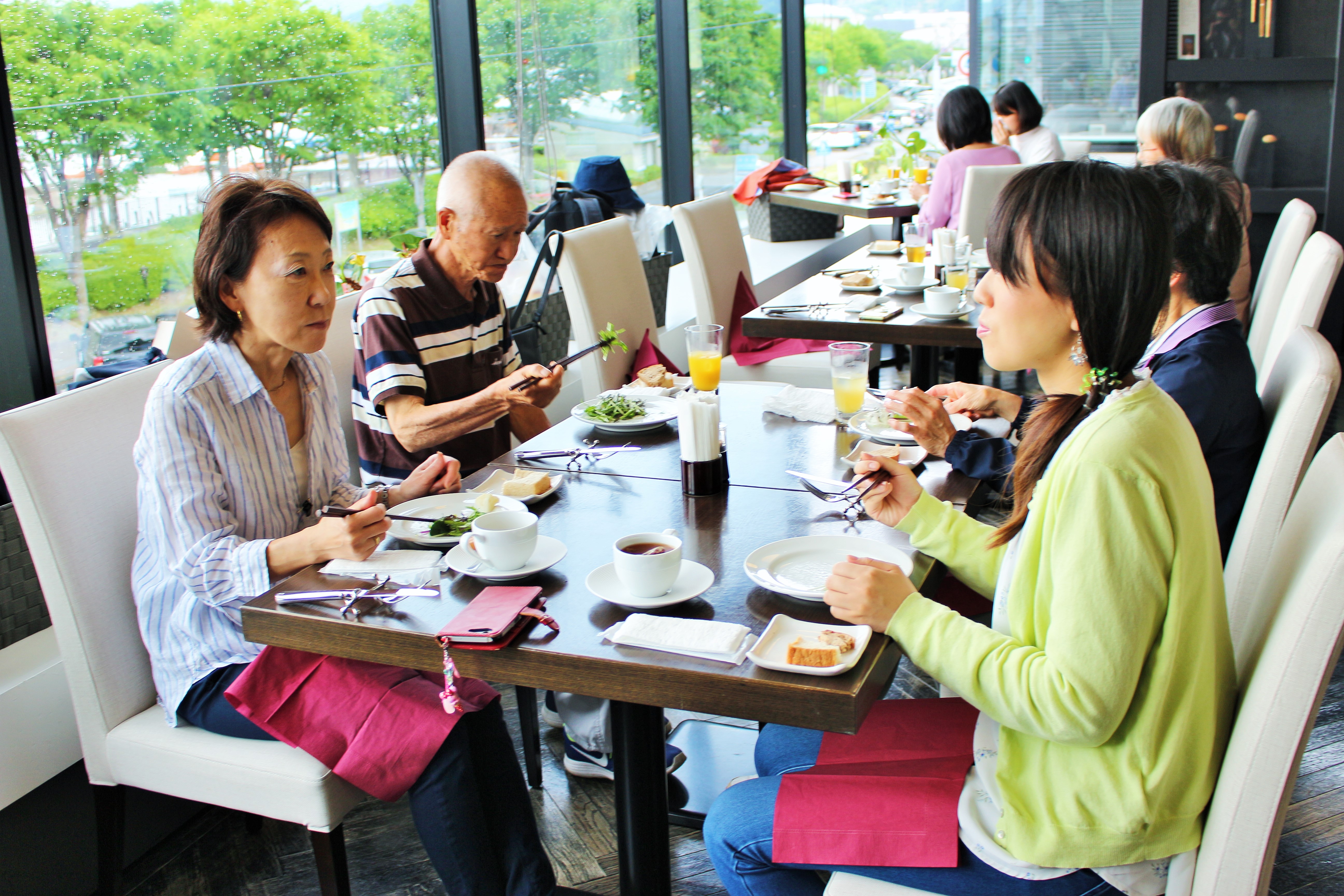 中央道から山脈を望み、ガイドさんのお話を聞いているうちに到着。「くらすわ」の1階にはこだわりのオリジナル商品と信州の銘品を集めたショップやベーカリーがあり、地元の方にも好評です。屋上のテラスからは諏訪湖が見渡せます。くらすわの紹介はこちらから