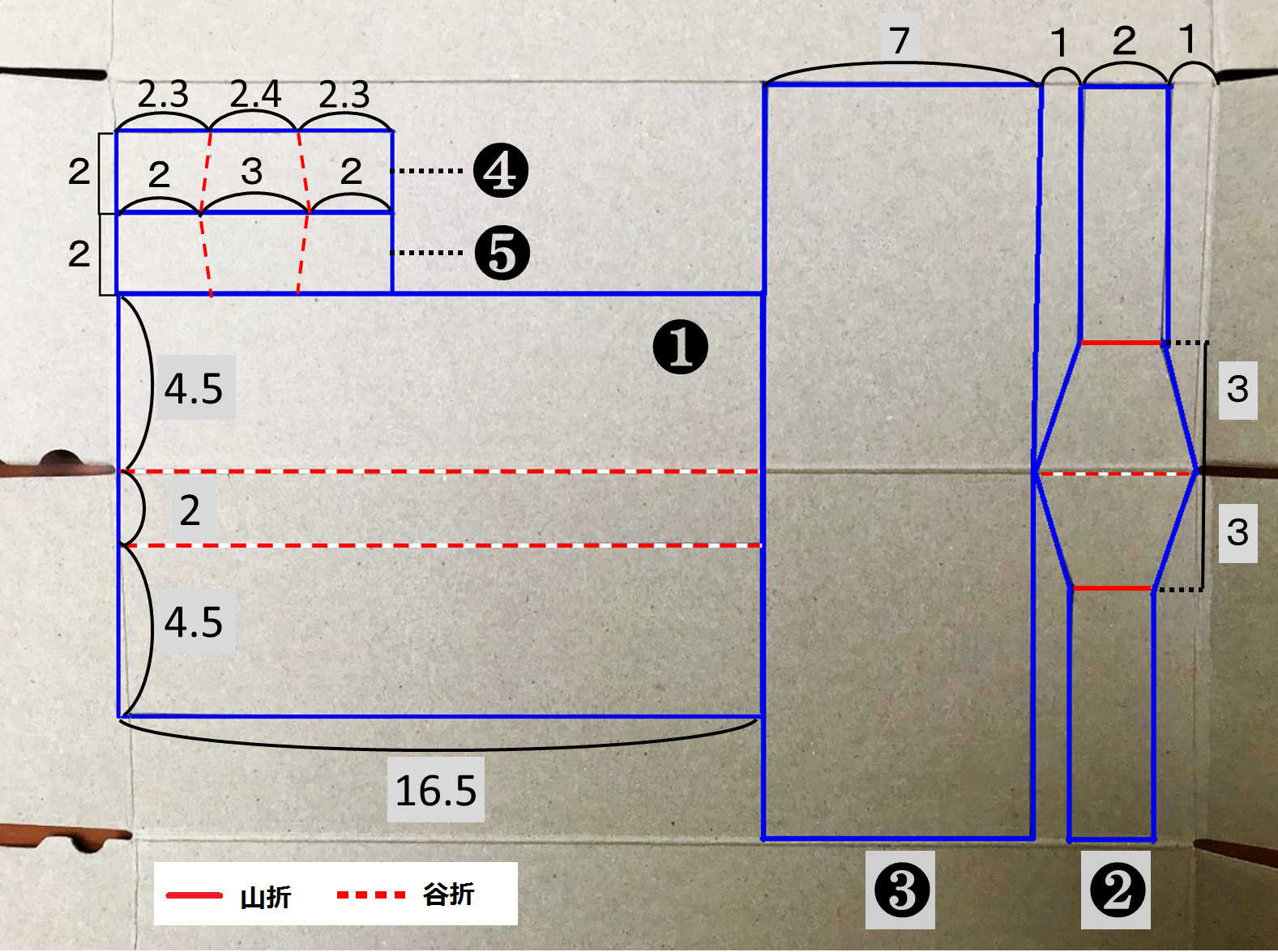 図内のサイズ(単位=cm)を参考に、青線の通りに下書きをして5つの部品に切り分けます。
