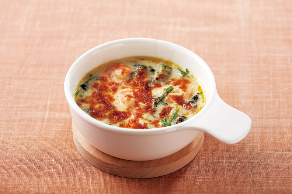 ほうれん草に、体を温めるエビ、巡りを促す玉ねぎ、免疫力を高めるマッシュルームをプラスしたほっこりグラタン。牛乳で作るお手軽ホワイトソースはあっさりとした味わいで、カルシウム不足も補えます。