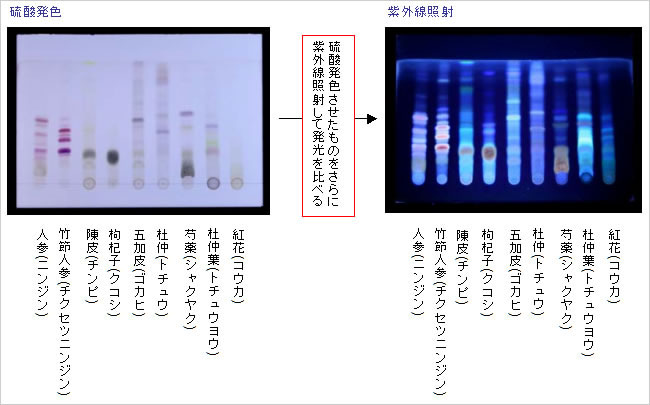 現在では、それぞれの生薬に含まれている成分や薬効について、さまざまな研究が行われています。成分の分析には様々な手法が用いられますが、その中でも「位置」と「色」によって視覚的に分析できる「薄層クロマトグラフィー」という分析法があります。この分析法は、成分が薄層板の上を展開溶媒とともに移動する速さが異なる性質、さらにそこに硫酸や紫外線を当てることによって、さまざまな色を発するという2つの性質をうまく組み合わせた手法です。