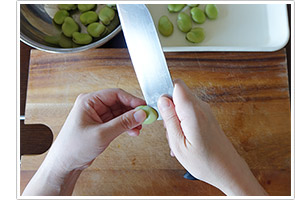1. 空豆はさやから外し、包丁でおはぐろ(黒い部分)をとって、おはぐろと反対のところに切れ目を入れる。