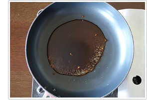 2. フライパンに昆布かつおだし、しょうゆ、きび砂糖、みりん、赤唐辛子を加え、軽く煮立てる。