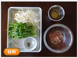 梅雨どきは、湿気の影響で体が重だるくなったり、むくみやすくなりがちです。利尿に良いとされる豆苗ともやしに、お腹を温めるといわれる鶏肉とにんにくを加えることで、梅雨冷え対策にも一役。あっさりした風味なので、食欲の落ちる季節におすすめです。