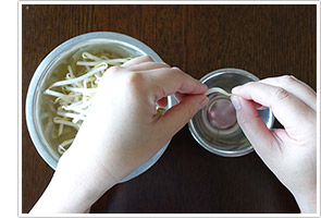 1. もやしはさっと水洗いし、根をつむ。