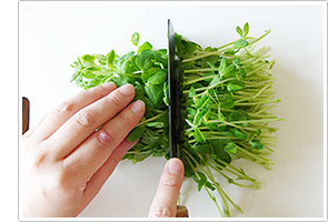 2. 豆苗は根を切り落とし、半分の長さに切る。