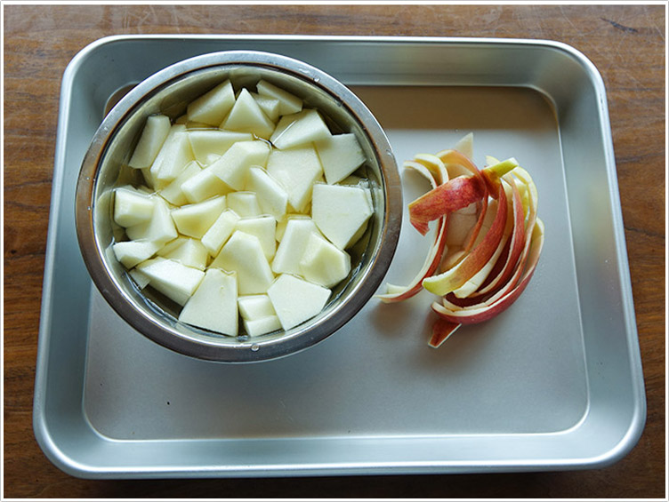 1. 塩(分量外)でりんごの皮を磨いてからよく洗って皮をむく(皮は捨てずにとっておく)。実はイチョウ切りにして軽く塩水にさらす。