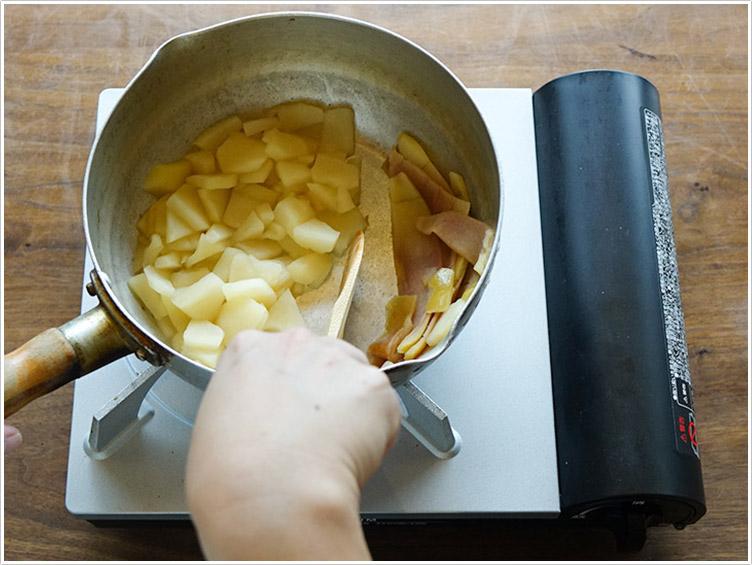 2. 鍋にりんごピューレの材料(皮も)を入れ、ふたをして弱火でりんごがやわらかくなるまで煮込む。