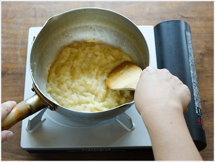3. 皮を取り出し、へらなどでりんごの実をつぶしてピューレ状にする。
